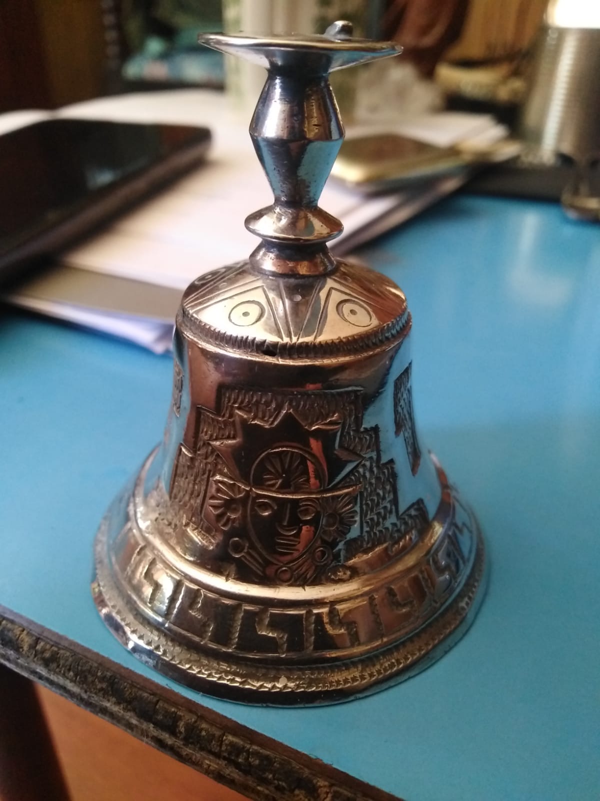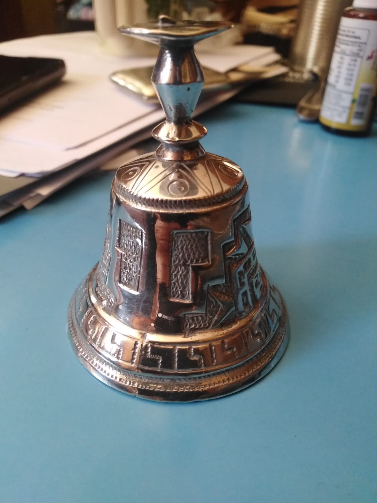 Hermosa campanita bañada en plata con grabados tipo precolombinos. Muy bonito adorno