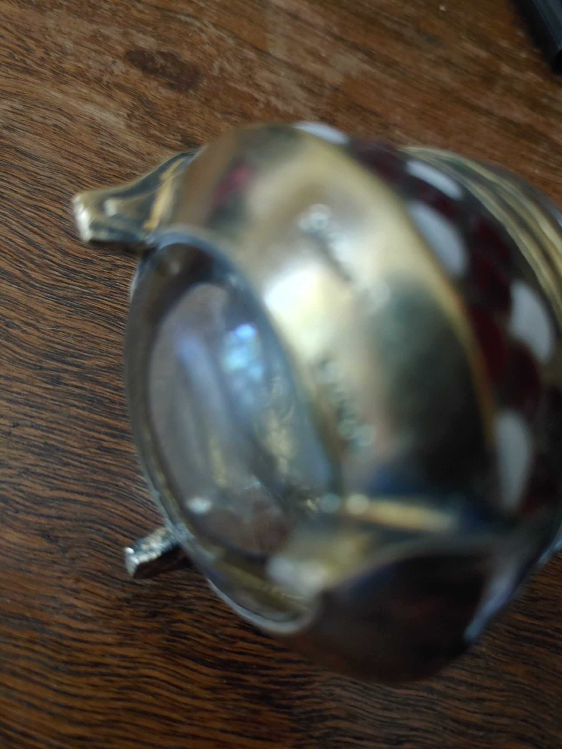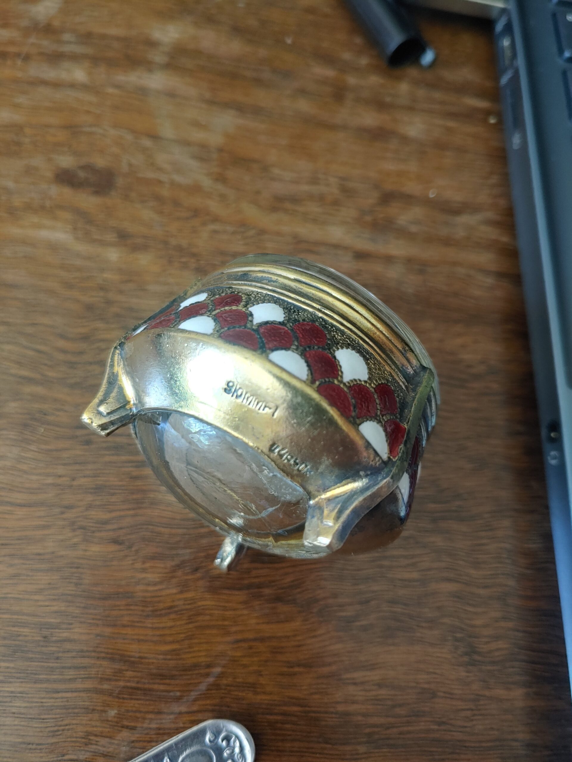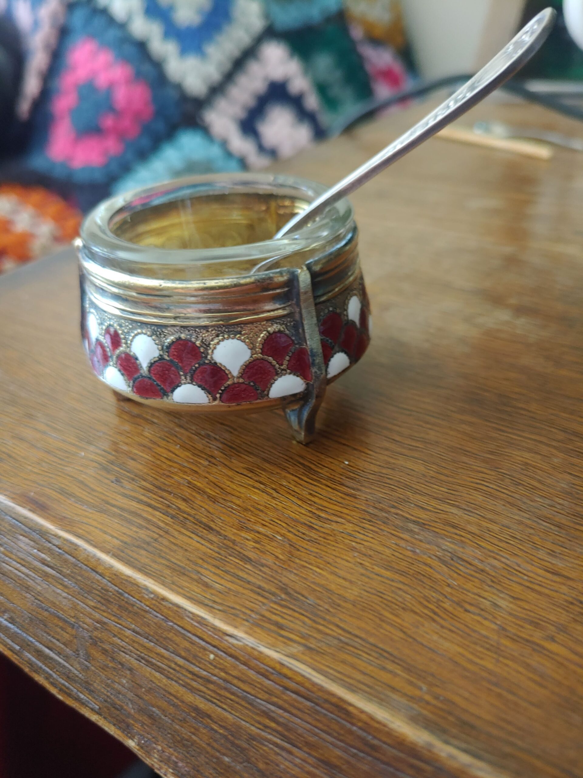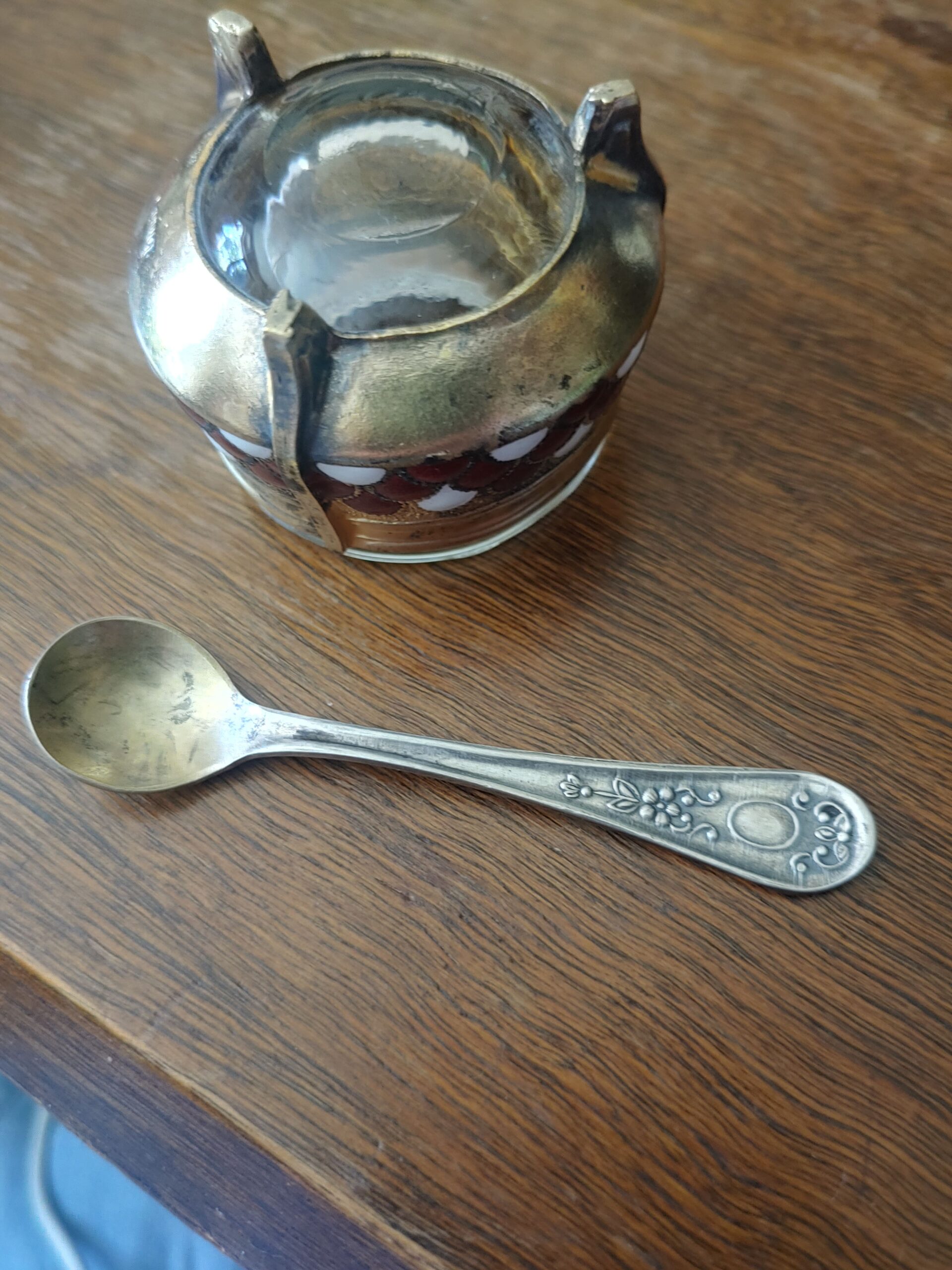 Fabricado en aleación de cobre y níquel, esmaltado. Con su cucharita, recipiente interno de vidrio. De los años 70. Con sello.
