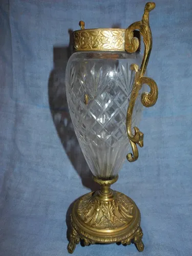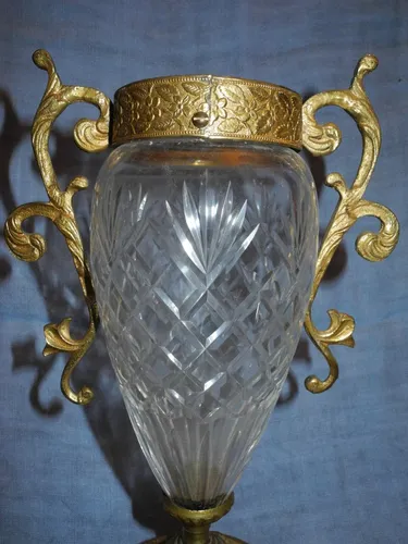 Jarrón francés cristal trabajado biselado con todos sus anexos de bronce tallado hermosa pieza para decorar la cubierta de una mesa elegante