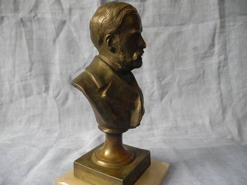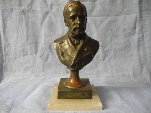 Busto de Louis Pasteur con el sello de fundición de París. Casi con seguridad realizado por Adriene Gaudez dada la similitud con la que está erigida en Dole, Francia y a otra pieza que se encuentra en subasta en Sotheby´s. Mide desde la base de mármol 28 cm y desde el pié de bronce 23 cm. La base de mármol mide 13 x 12,5 cm y la base de bronce mide 8,5 x 8,5 cm. Es una verdadera pieza de arte de la segunda mitad del siglo XIX.