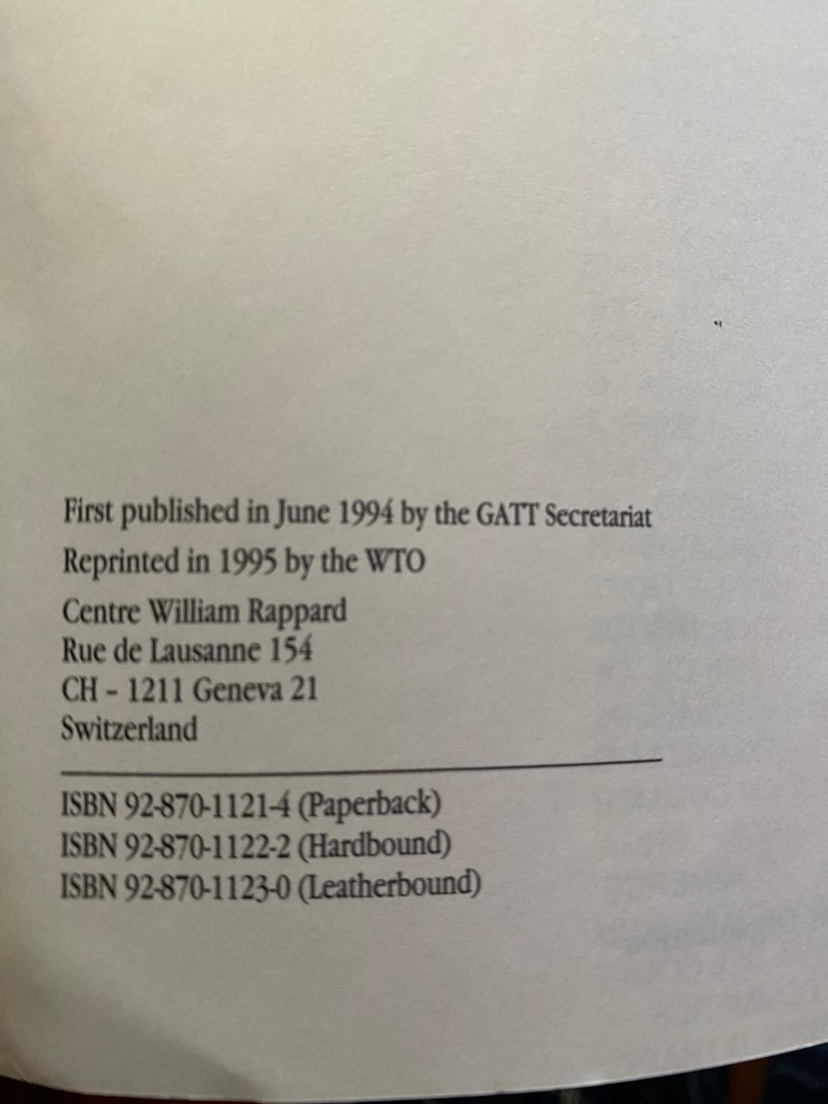 Editor: Publicado originalmente en junio de 1994. Esta es una reimpresión realizada en 1995 por la Organización Mundial de Comercio (World Trade Organization en Ginebra Suiza)