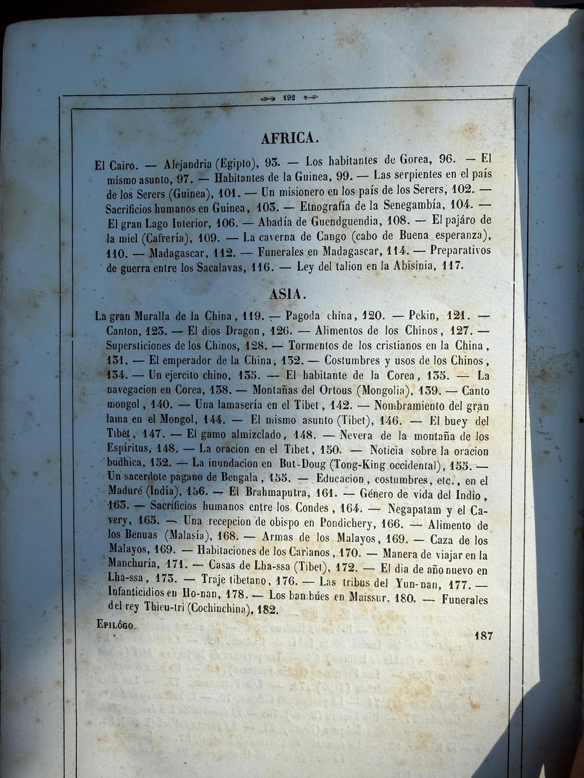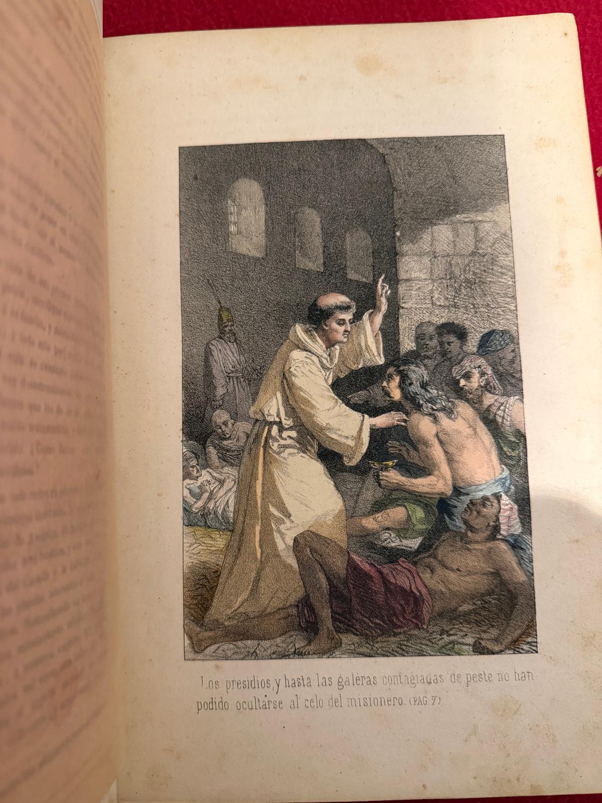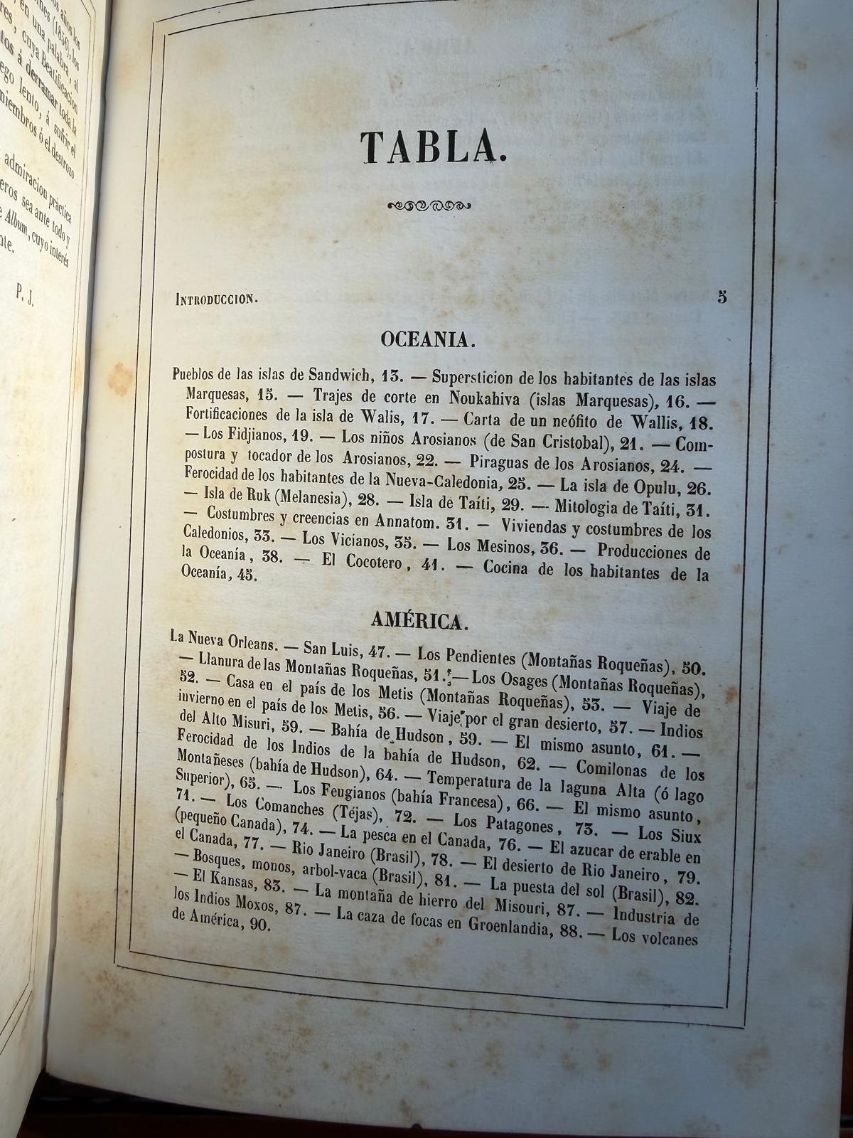 Primera edición de este precioso libro dedicado a las misiones en Oceanía, América, Asia y África, y las costumbres y usos de sus habitantes, ilustrado con 24 bellas láminas grabadas en litografía y coloreadas a mano en el momento de la publicación, todas protegidas con papel seda, siendo estas imágenes lo más valioso de esta edición, ya que sirven como registro visual de estas culturas y paisajes desde la perspectiva de la época. Entre las misiones americanas que se describen encontramos Nueva Orleans, Montañas Rocosas, Bahía de Hudson, Texas, Misouri; Texas; Canadá, Brasil, la Patagonia Y Oceanía. Buen ejemplar, ligero óxido ocasional generalmente marginal.