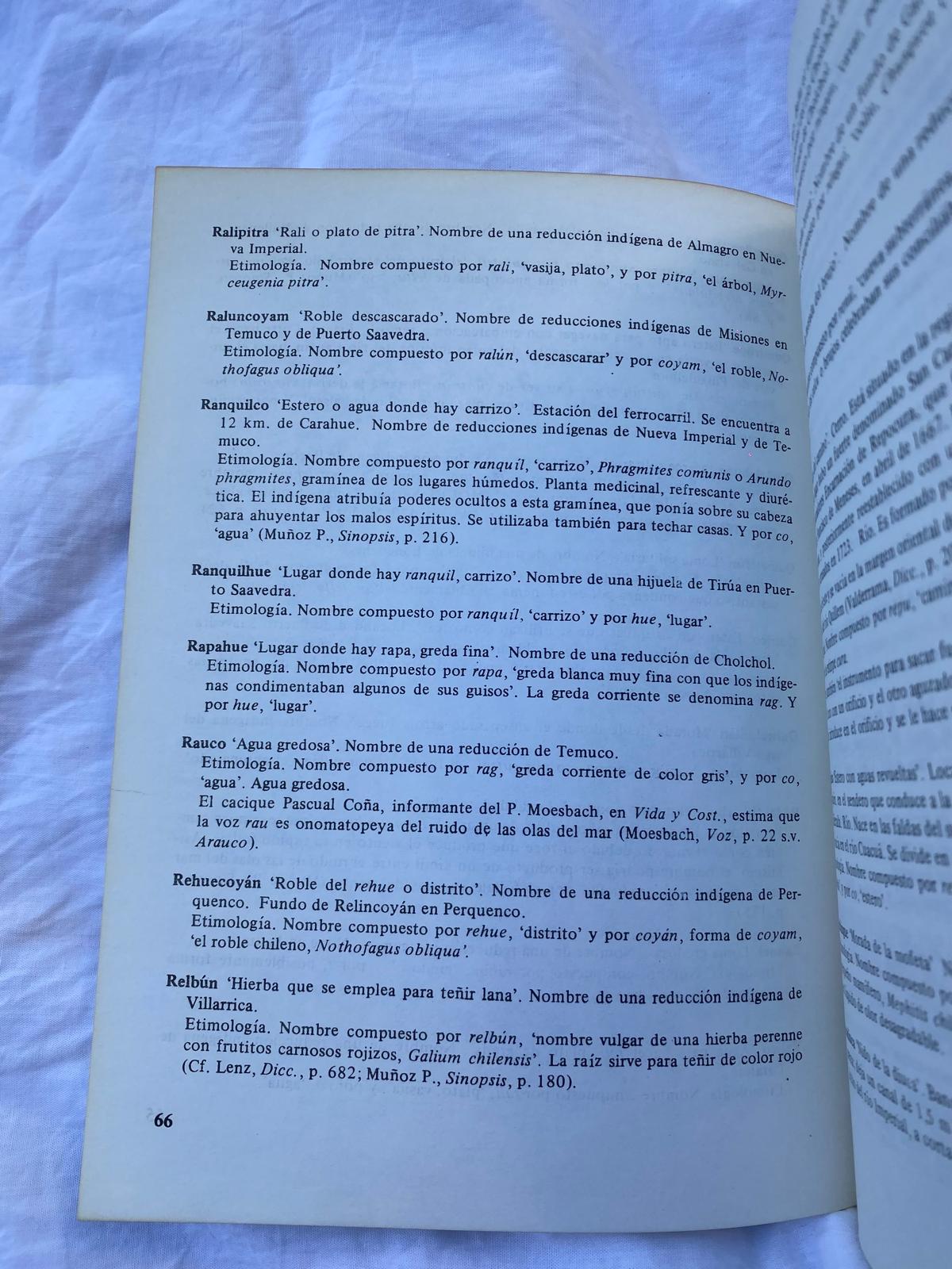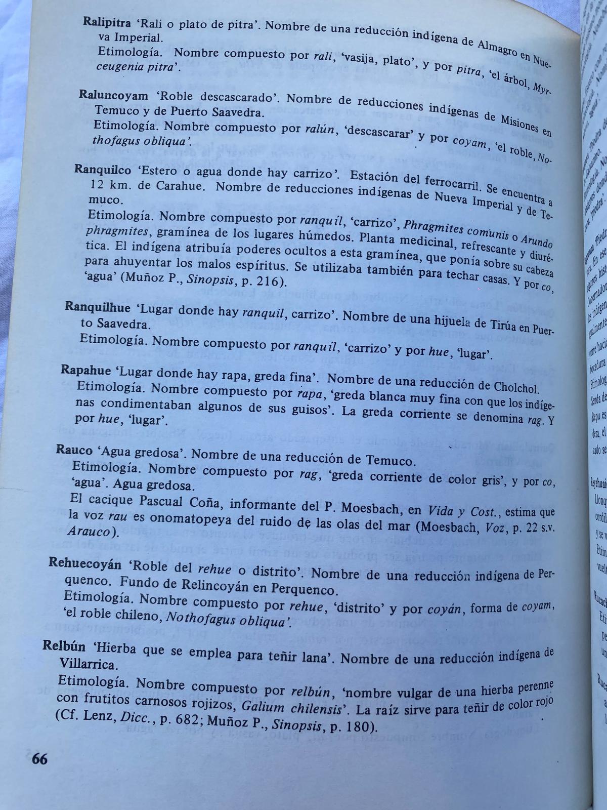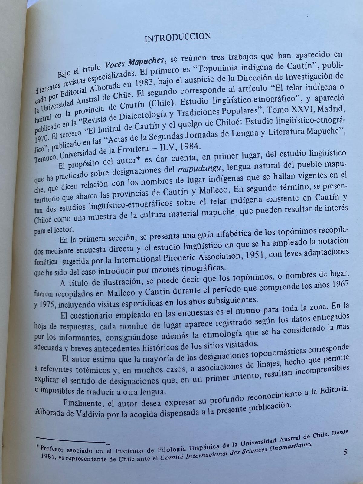 El propósito del autor es dar cuenta, en primer lugar, del estudio lingüístico que ha practicado sobre designaciones del mapudungu, lengua natural del pueblo mapuche, que dicen relación, con los nombres de lugar indígenas que se hayan vigentes en el territorio que abarca las provincias de Cautín y Malleco.
